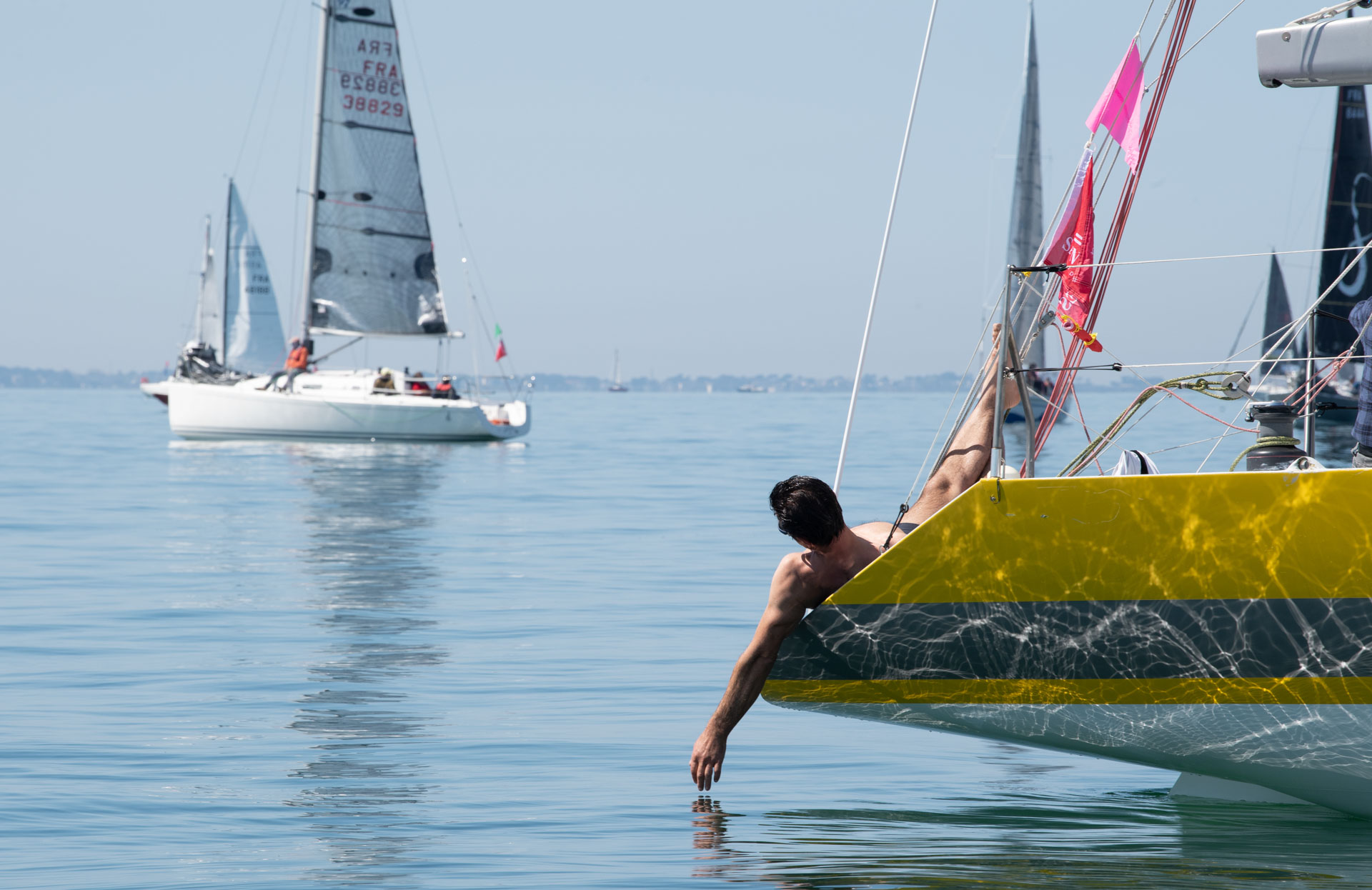 Nada. 0. Rien. Pas un souffle d’air sur le terrain de jeu du Spi Ouest-France – Banque Populaire Grand Ouest. Pétole molle comme on dit dans le jargon. Les 380 équipages ont patienté près de 6 heures durant sous le soleil et sur une mer miroir, plate comme une limande, attendant que le vent daigne pointer le bout de son nez. Ambiance potache et premiers bains de mer ont rythmé cette drôle de journée avant qu’un léger souffle permette à 16h30 de lancer des départs.