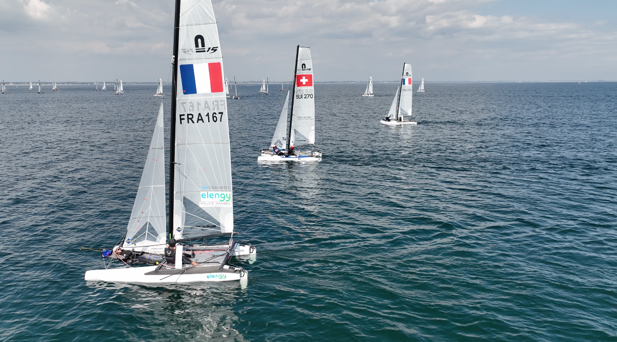Dernier jour du Championnat Européen Nacra 15 au Yacht Club de Carnac (YCC), les conditions ont été difficiles pour Françoise Dettling, présidente du Comité de Course, et pour les coureurs. Un vrai casse-tête pour l’organisation et ce sont finalement deux manches qui ont été lancées dans un vent oscillant en direction et en force, passant de 7 à 3 nœuds en un instant et changeant de direction sans arrêt.