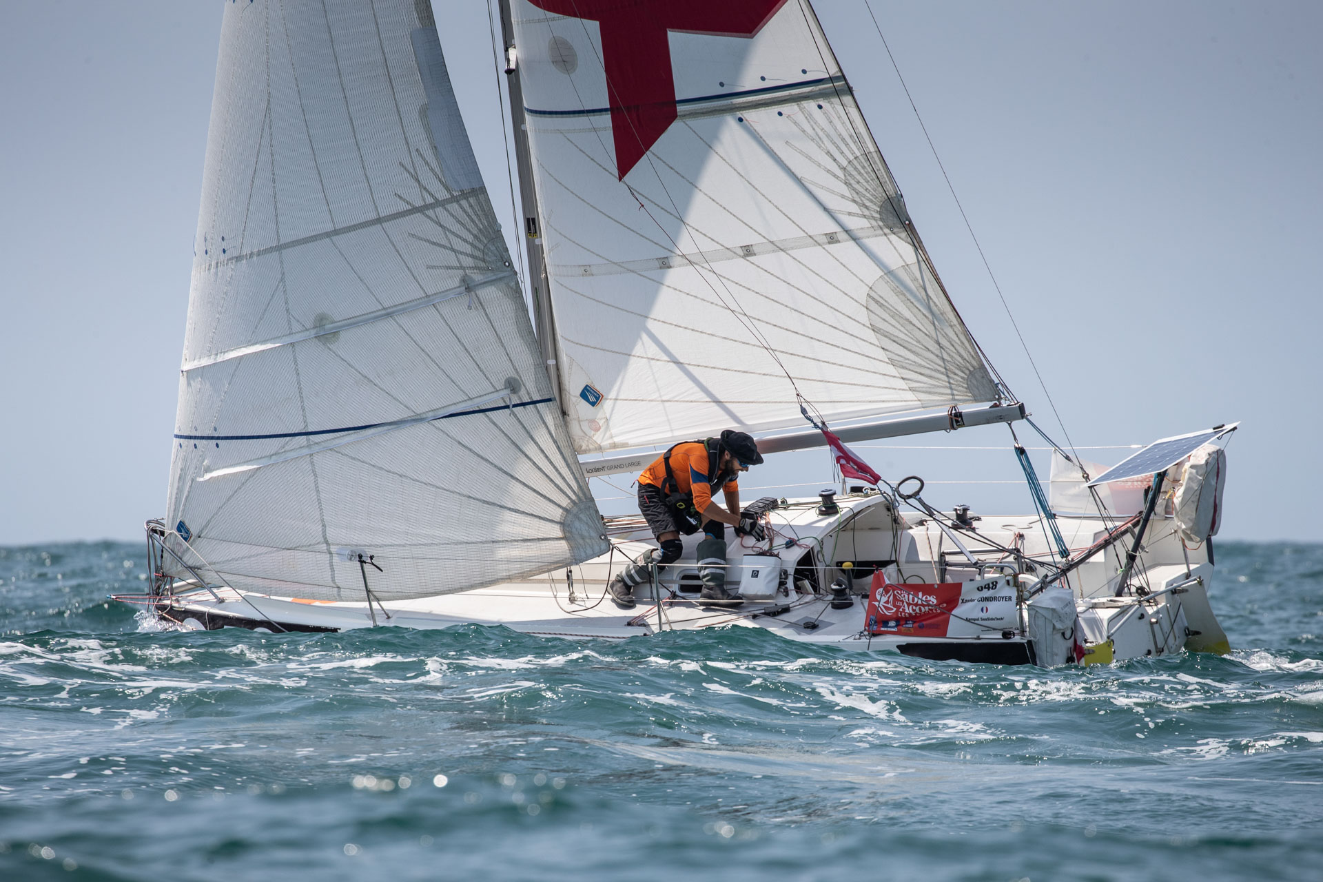 Aussi, si ces derniers composent encore avec un flux de sud-ouest, les autres évoluent maintenant dans un vent de secteur nord nord-ouest. Un vent qui reste toutefois faible puisqu’il peine à dépasser les 6-7 nœuds, mais aussi et surtout qui souffle de manière très irrégulière. Les solitaires doivent donc s’adapter à ces différences de pression et rester concentrés sur leurs réglages pour grappiller ce qui peut l’être et se rapprocher du but. « Comme attendu, la journée va être délicate dans ce vent mou et mal établi », explique Christian Dumard, le consultant météo de l’épreuve. Selon les derniers fichiers, à partir de la nuit prochaine, la situation devrait heureusement s’améliorer doucement, en tous les cas dans un premier temps pour le leader, Pierre Le Roy (1019 – TeamWork). Ce dernier devrait, en effet, retoucher davantage de pression dans les 150 milles avant l’arrivée. Petit bémol, il se retrouvera au près. A date, son arrivée est ainsi estimée en en fin de journée de mercredi avec, a minima, une avance d’une quinzaine d’heures sur son dauphin. « Un nouveau front – pas très actif toutefois -, est prévu de passer sur le reste de la flotte dans la journée du 27. Pour le gros du peloton, l’étape va se finir avec du vent de nord-ouest pas très fort et qui pourrait avoir pour effet de resserrer la flotte aux abords de l’archipel », note Christian. De quoi rajouter un peu de piment, notamment chez les bateaux de Série où le match est ultra serré entre les deux leaders, Léo Bortorel (987 – Les Optiminites – Secours Populaire 17) et Jean Marre (991 – Sport dans ma ville – Time for the planet), mais aussi à tous les étages. A noter par ailleurs : Anne-Gaël Gourdin (679 – Roll my chicken) a indiqué à la Direction de course s’être brulée avec son Jet-boil. La navigatrice, qui pointe actuellement en 3e position chez les Protos, poursuit malgré tout sa course avec une vitesse et un cap normaux.