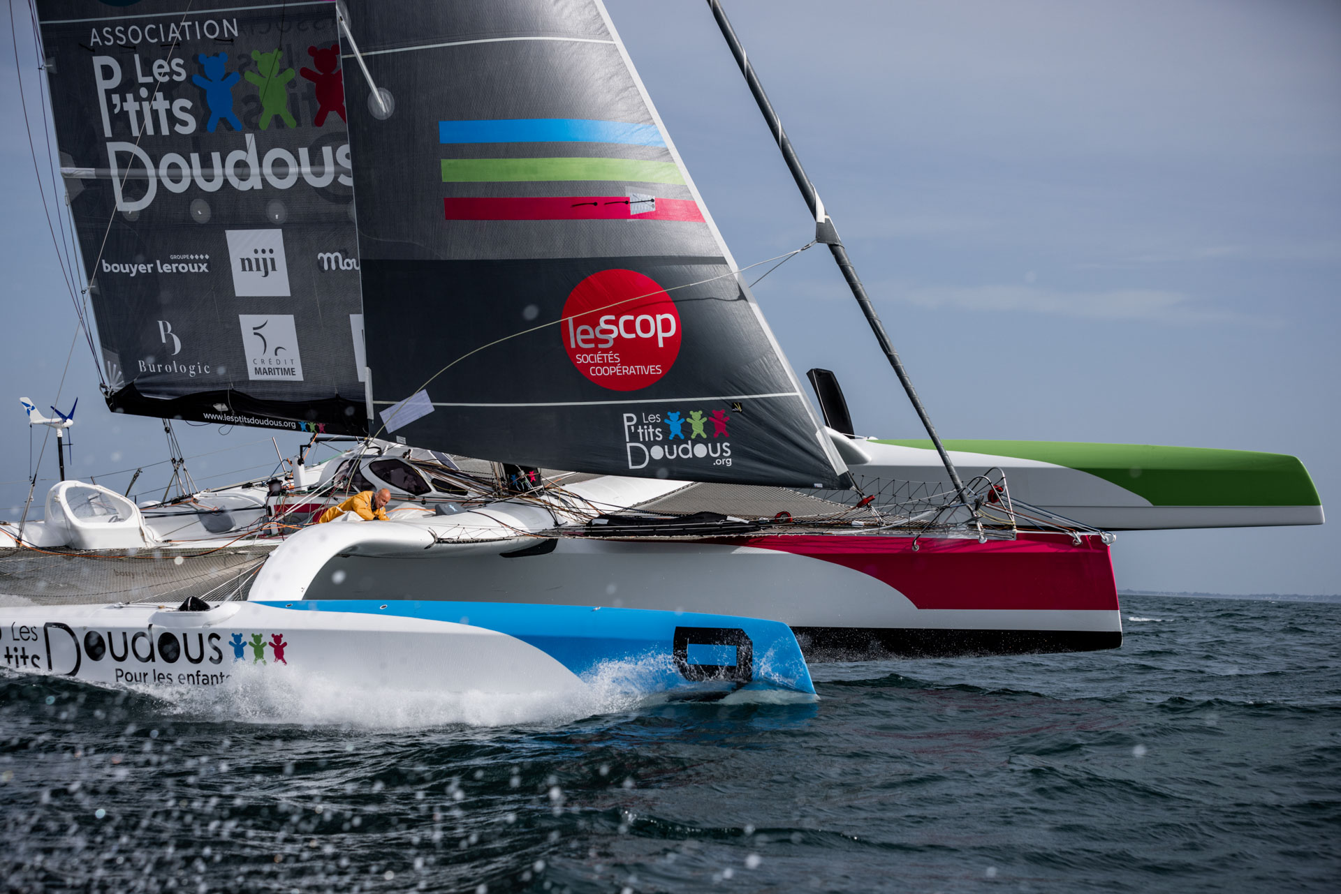 Le trimaran Ocean Fifty « Les P’tits Doudous » sera au départ de la Route du Rhum – Destination Guadeloupe le 6 novembre et c’est déjà un exploit. Armel Tripon, tenant du titre de la prestigieuse course transatlantique en solitaire, navigue avec le nouveau mât de son bateau depuis trois semaines. Un tour de force rendu possible par la mobilisation de toute une équipe et des soignants des « P’tits Doudous ». Interrogé, le skipper nantais est à la fois satisfait et confiant…