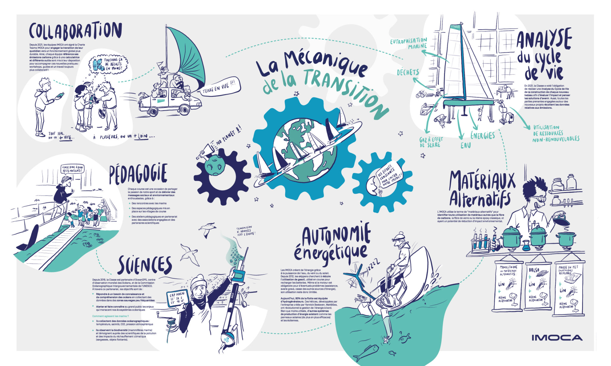 En 2018, les skippers IMOCA ont décidé d’inclure la transition environnementale dans leurs travaux. Pour se faire, la Classe a recruté une équipe afin de travailler ce sujet complexe toute l’année avec pour méthode, la mise en commun des expertises des équipes et de la filière technologique (architectes, chantiers, fournisseurs, etc.). Même si la compétition anime notre sport, c’est bien la collaboration qui prévaut en matière de développement durable. Et, en 2021, les skippers IMOCA ont voté les premières règles* de jauge allant dans le sens de l’action.