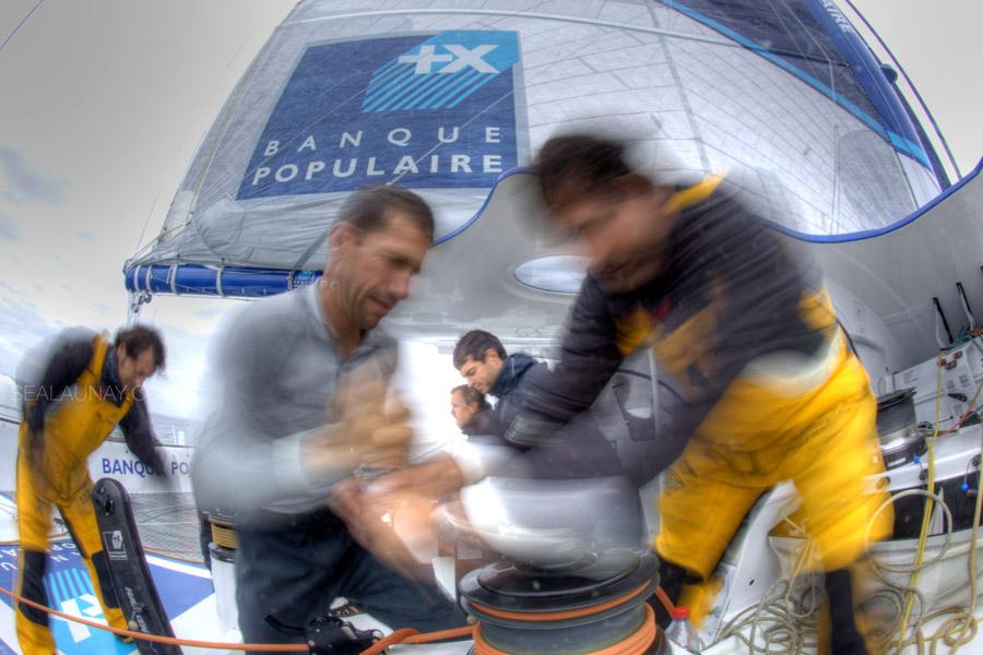 Loïck Peyron, skipper du Maxi Banque Populaire V, explique cette possibilité de départ et la complexité de la situation : « Nous avons décidé avec Ronan Lucas (directeur du Team Banque Populaire) de convoquer l’équipage à Brest, car nous observons depuis une semaine déjà une fenêtre de tir possible. Nous regardons très attentivement les systèmes météo dans l’Atlantique Nord et l’Atlantique Sud et constatons que les prévisions dans le Sud sont très bonnes à 10-12 jours mais qu’en revanche il y a une sorte d’irrégularité dans les prévisions de l’Atlantique Nord. Il y a encore quelques jours la situation était bonne, mais elle se dégrade au fil du temps. Notre problématique actuelle est la suivante : pour le moment nous n’avons que très peu de vent pour partir de Ouessant (alors qu’en général on part dans des conditions de brise pour un Jules Verne), et si nous n’arrivons pas à « décoller » assez vite de cette zone, nous nous retrouverons bloqués au niveau des Canaries. Maintenant, il y a tout de même une opportunité, un petit trou de souris à saisir, car si on arrive à « décoller » de Ouessant, on pourra réussir à attraper la dépression à temps et arriver à l’Équateur puis dans le Sud dans de très bons temps.