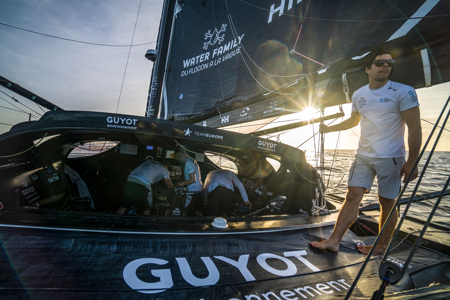 Alors que l’ensemble de la flotte est ralentie après les conditions optimales d’alizés de ces dernières 24 heures, personne n’a été plus affecté que GUYOT environnement – Team Europe, qui semble ne pas avoir eu de chance à l’est.