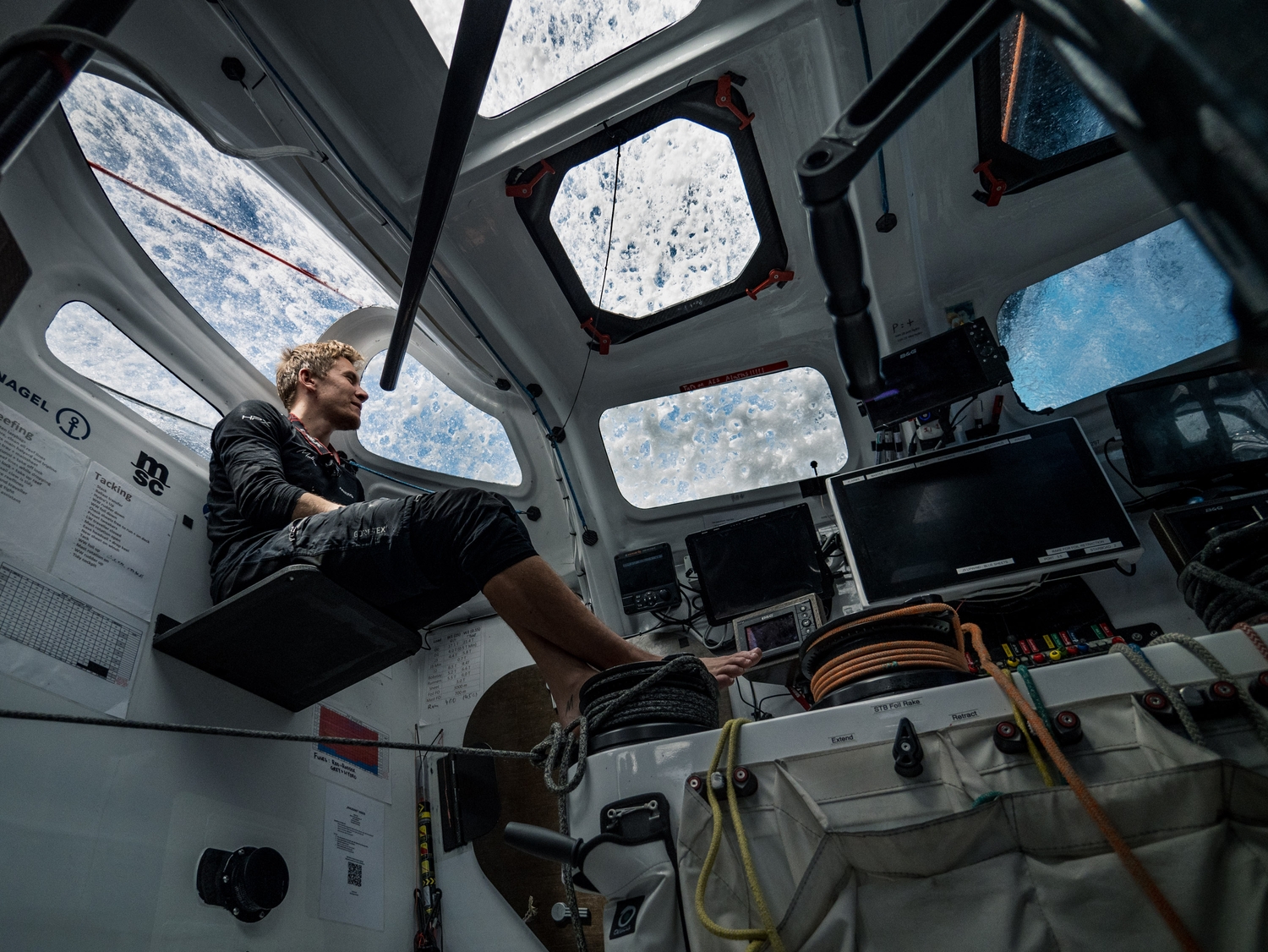 « Et puis il y a le bruit du bateau et le vrombissement du foil. Plus le bourdonnement est fort, plus vous allez vite et plus le risque de piquer du nez est grand. Il arrive que l’on entende le bourdonnement et que l’on s’accroche à quelque chose, sans bouger, en attendant l’inévitable. Et puis vous pouvez continuer votre journée. Mais cuisiner, aller aux toilettes, changer de vêtements, tout cela est très difficile. »