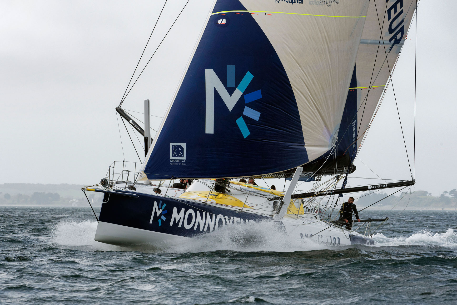 Les bateaux à dérive ont de beaux restes et à chaque course, ils ont décidément le don de mettre leur grain de sel parmi les foilers. Dans le rôle du trouble-fête de cette première nuit au milieu des mastodontes de technologies : Monnoyeur – Duo for a Job. Les observateurs avaient constaté que Benjamin Ferré et Pierre Le Roy, deux ex-Ministes aux grands sourires, s’étaient déjà élancés de la meilleure des manières lors du ‘top départ’, dimanche à 14h. Et quand la flotte s’est mise à tricoter en vue du waypoint de ‘Tout commence en Finistère’, le duo a tenu bon, restant jusqu’à ce matin (8 heures) en tête du classement.