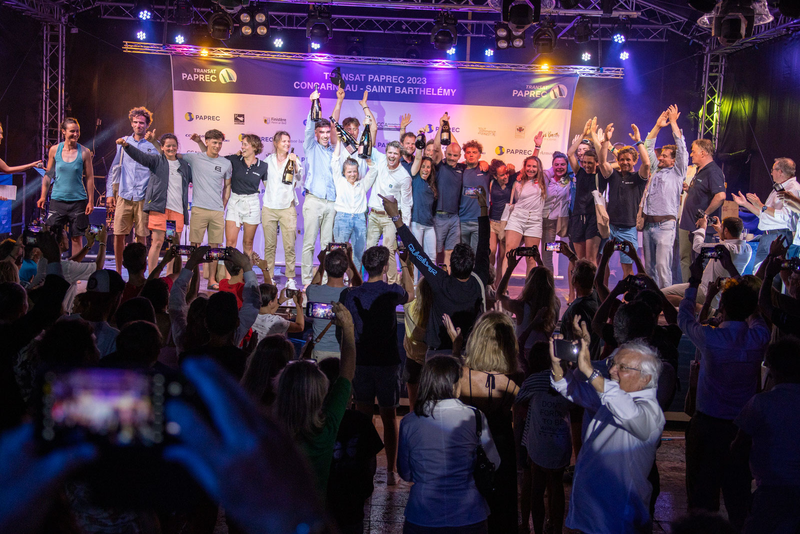 Les onze duos en lice sur la 16e édition de la Transat Paprec ont été mis à l’honneur samedi soir sur la scène du Village Arrivée de Gustavia (Saint-Barthélemy) lors de la traditionnelle cérémonie de remise des prix qui a eu lieu en présence des partenaires de la course. Cette belle soirée a permis au grand public de venir applaudir l’ensemble des concurrents, dont Loïs Berrehar et Charlotte Yven (Skipper MACIF). Ces derniers, qui ont inscrit leurs noms au palmarès de la course, se sont notamment vu remettre chacun une montre par Halchimy, Chronométreur Officiel de la Transat Paprec. De leur côté, Corentin Horeau et Pauline Courtois (Mutuelle Bleue) ont remporté le Trophée Suzuki de la Combativité.
