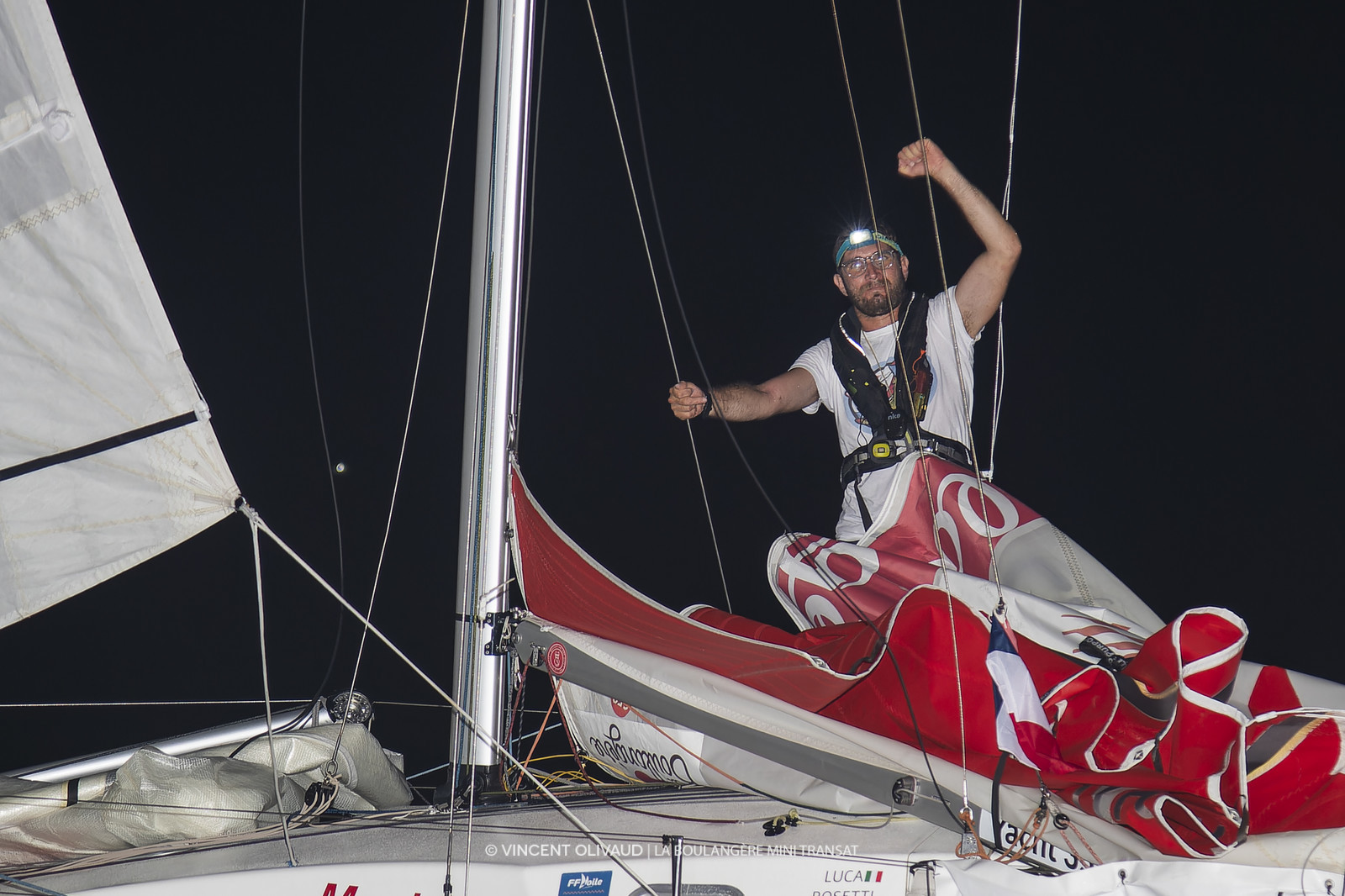 Premier bateau de Série – 5e au scratch – à se présenter sur la ligne d’arrivée de la deuxième étape de La Boulangère Mini Transat ce dimanche 12 novembre à 1h26 (heure de Paris) au large de Saint-François, Luca Rosetti (998 – Race = Care) a frappé un grand coup. Parfaitement dans le match dès les premiers milles, le navigateur italien a réalisé une trajectoire quasi parfaite, légèrement au nord de la route directe. Une stratégie qui lui a permis de terminer la course avec une avance de plus de 60 milles sur son dauphin, et plus du double sur le trio gagnant du premier round. Tant et si bien qu’il est plus que probable qu’il comble ses 15h05 de retard encaissées aux Canaries et qu’il se hisse, du même coup, sur le podium au classement général. Le suspense va néanmoins rester à son comble au moins jusqu’à l’arrivée de Michaël Gendebien (971 – Barillec Marine – Actemium) prévue ce dimanche après-midi, mais les émotions sont déjà fortes, tout comme le sentiment du travail bien fait.