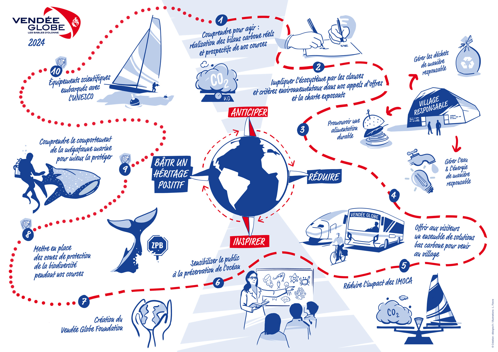 Au-delà des causes soutenues par les skippers, l’organisation, elle aussi, s’engage. La démarche s’inscrit dans une perspective de long terme et s’articule autour de 10 engagements, répartis en quatre axes forts : Anticiper, Réduire – tant l’impact du village que celui des visiteurs ou encore des bateaux – Inspirer et Bâtir un héritage positif en créant le Fonds de Dotation « Vendée Globe Foundation » afin de notamment financer la coordination des sciences participatives des skippers autour du monde en partenariat avec l’UNESCO.