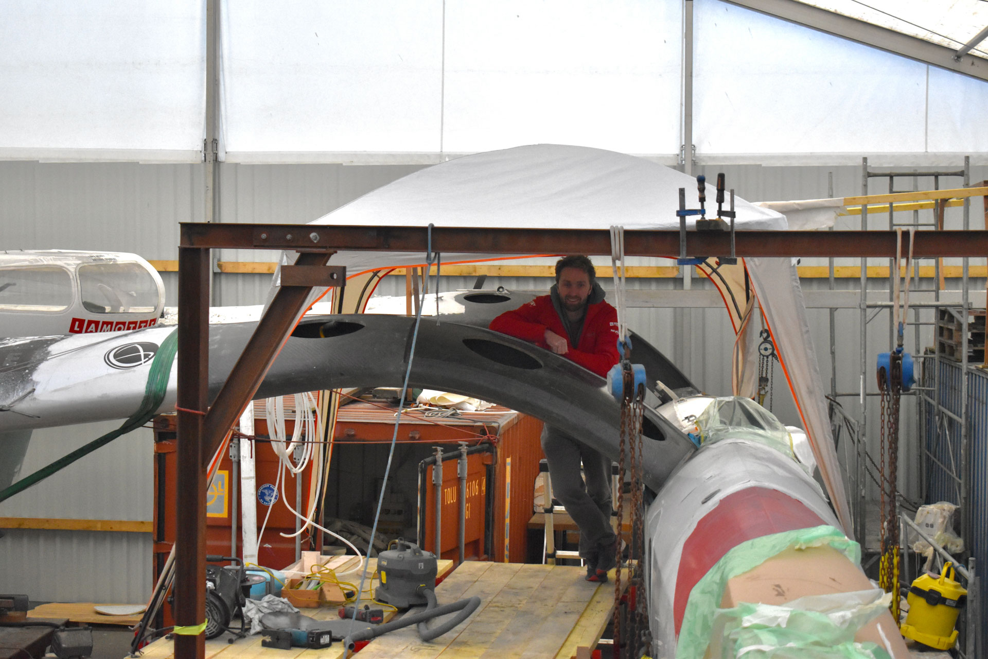 Étape suivante : réparer les dégâts, qui étaient conséquents. Pour cela, Luke Berry s’est rapproché d’un autre skipper de la classe Ocean Fifty, Thibaut Vauchel-Camus. Les deux équipes ont mutualisé les coûts pour monter une grande tente de 700 mètres carré permettant de prévoir un chantier hivernal à l’abri des intempéries. « Cela me tenait à cœur que les réparations s’effectuent à Saint-Malo. Nos locaux sont ici, les membres de mon team vivent ici », précise Luke.