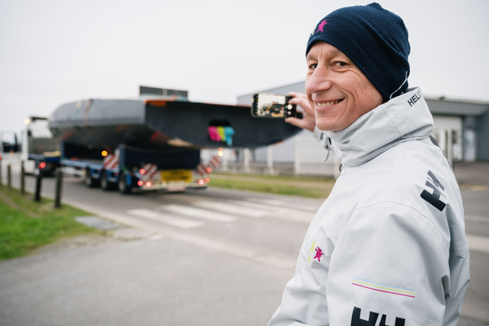Si la construction d’un bateau de course est rarement un long fleuve tranquille, elle est toujours jalonnée d’étapes clés qui permettent à ses acteurs de toucher du doigt son évolution. La pose du premier pli de carbone, le démoulage de la coque ou le pontage avaient déjà fourni à Armel Tripon un premier lot d’émotions fortes ces derniers mois. La sortie du bateau du chantier DUQUEINE Atlantique, ce mardi matin de décembre, est venue marquer la fin d’une première phase essentielle de la naissance de l’IMOCA Les P’tits Doudous. Les yeux pleins d’étoiles, le skipper nantais résumait ainsi le moment : « C’est un peu comme un Vendée Globe. On vient de se faire l’Indien et on a encore un Pacifique devant nous. La partie est loin d’être terminée mais c’est déjà une grosse étape qui fait du bien à tout le monde. A partir de maintenant, chaque jour qui passe nous rapproche de la mise à l’eau. Mais c’est déjà un très beau cadeau de Noël. Le fait de le voir sans ses échafaudages me donne l’impression de le découvrir vraiment. On peut réellement apprécier ses lignes. C’est émouvant, ça fait du bien. Il est vraiment très beau, racé, harmonieux, puissant. Maintenant je vais avoir hâte de le voir à l’eau ! Les prochaines étapes vont arriver très vite ».