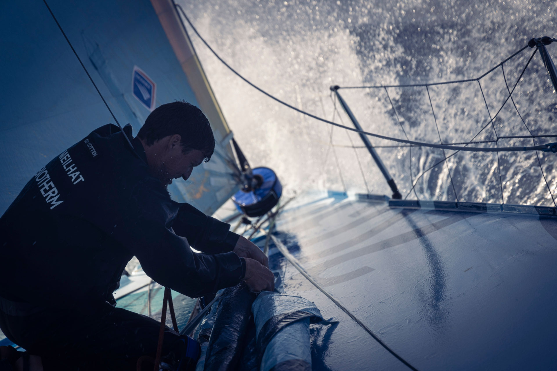 Pour les trois premiers, la priorité était de veiller à une rotation de vent dans la journée, de Nord-Ouest à Sud-Ouest. Un passage de front les a en effet accaparés obligeant à passer de bâbord amure à tribord amure. Pas de quoi entamer la bonne humeur du leader, Charlie Dalin, après une semaine à couteaux tirés avec ses deux rivaux :