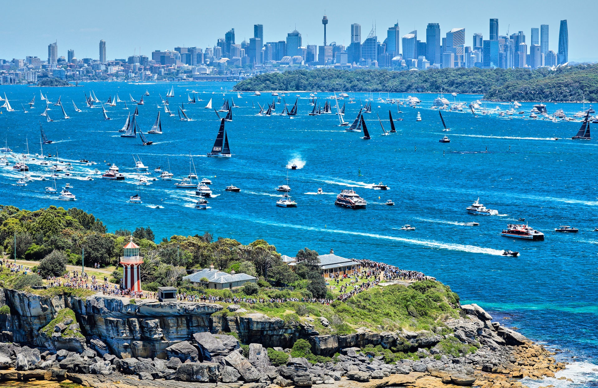 La flotte de 104 bateaux a passé le temps avant le départ de 13h00 à manœuvrer de façon spectaculaire pour se positionner le long des quatre lignes de départ, sous le regard d’une immense flottille de bateaux spectateurs et de Sydneysiders entassés le long de l’estran du port.