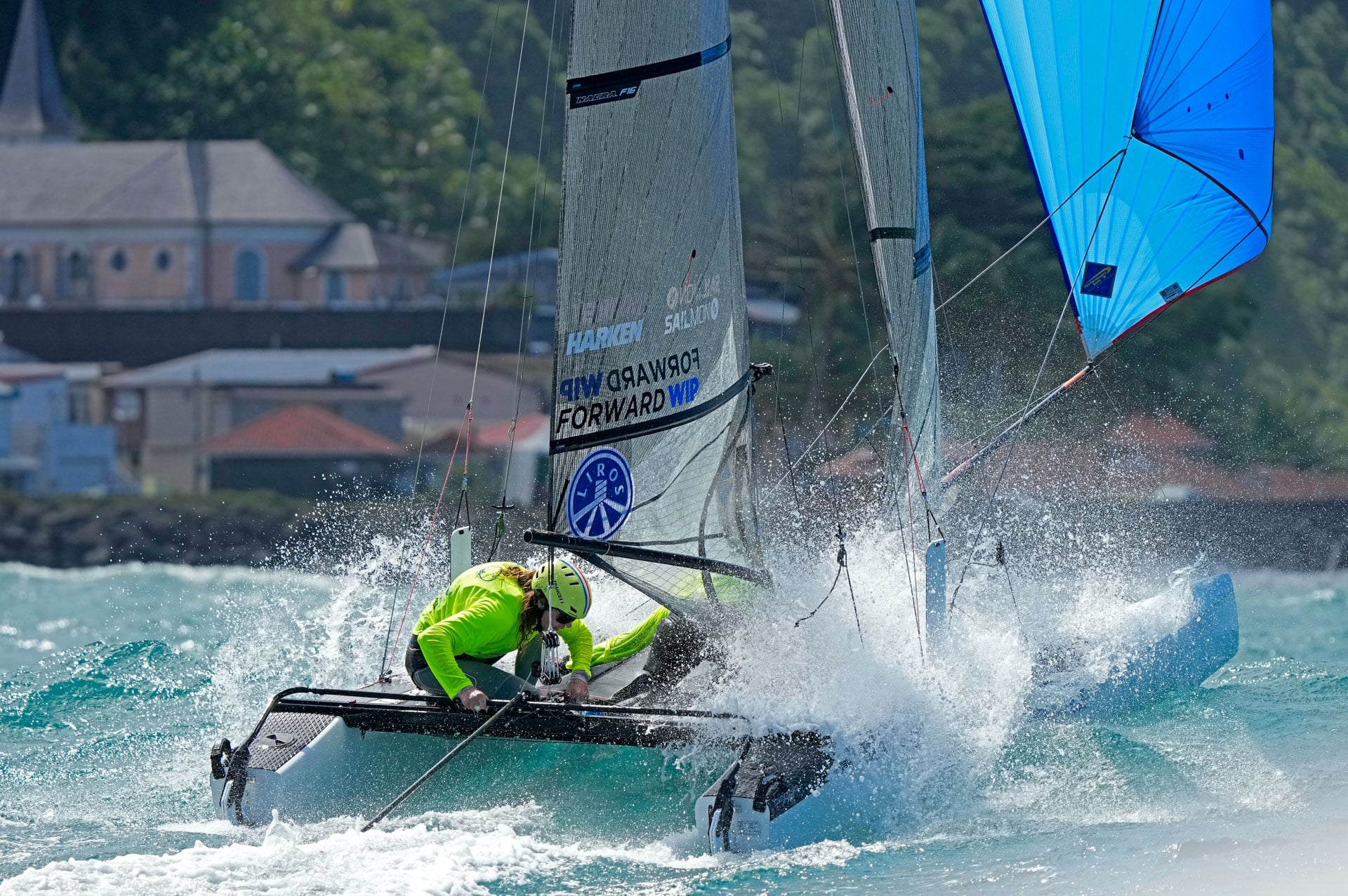 Les 34 équipages engagés en Catamaran F18 et F16 et les 9 riders wing foils ont pris beaucoup de plaisir sur cette étape marathon de 30 milles entre le Robert et Le Prêcheur. Conditions soutenues au départ, dessalages en série du côté de Grand Rivière, mistoufles à la Perle, cette première manche a été pour le moins animée !