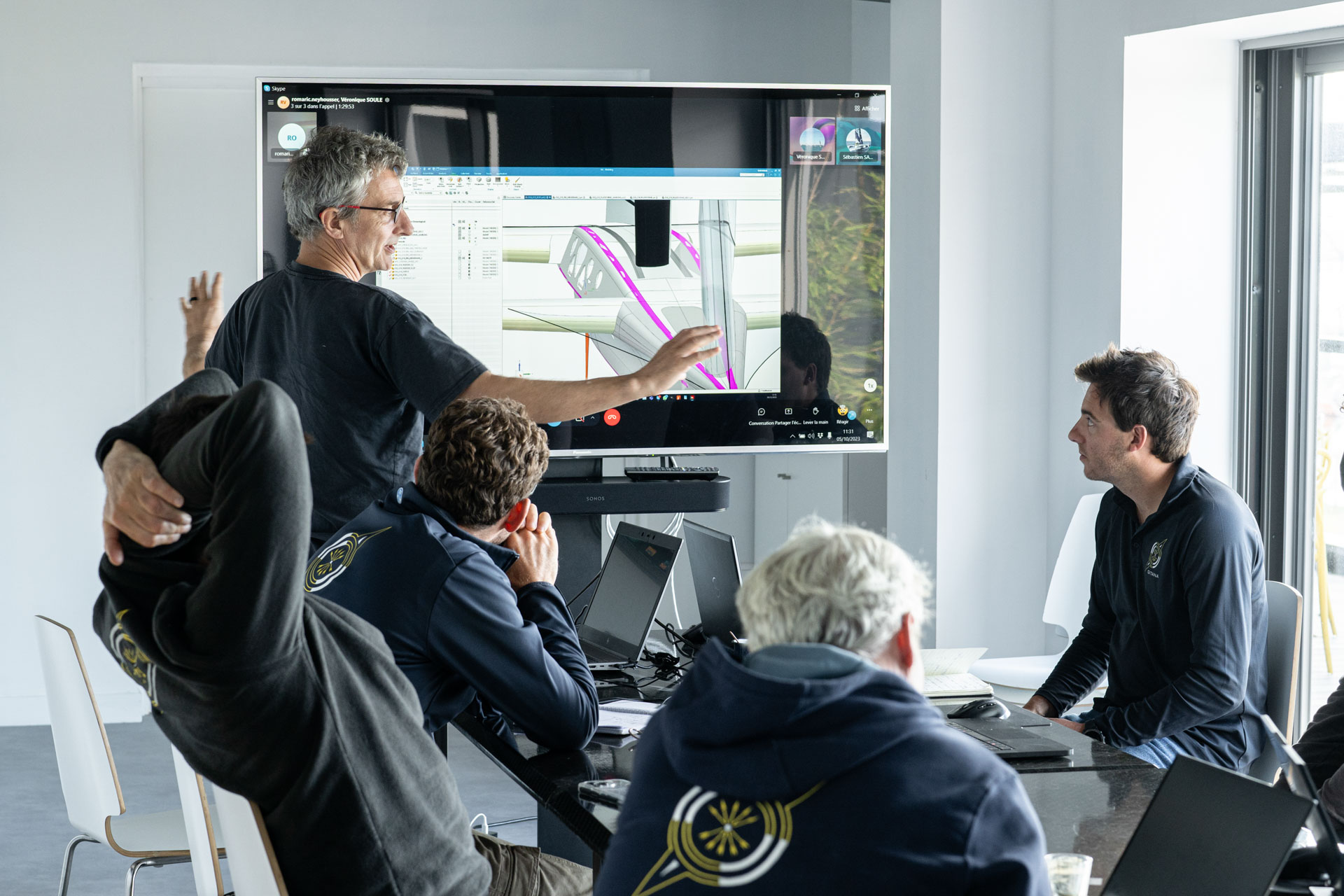 Pour concevoir ce nouveau Maxi Edmond de Rothschild, l’équipe aux cinq flèches a également élevé son niveau d’expertise en termes de conception. Le bureau d’études maison compte huit personnes à temps plein ; des profils jeunes et très talentueux issus de formations d’architecte naval ou d’ingénieur avec des champs d’expertise très pointus comme le calcul de structure… « Le bureau d’études dirigé par Sébastien Sainson s’est énormément étoffé depuis 2017 avec des gens extrêmement brillants. La diversité du panel des personnes qui sont arrivées dans le bureau est une force car on a tous à apprendre l’un de l’autre. Il y a des idées qui viennent de partout. C’est une vraie richesse d’avoir plein de personnes qui travaillent en collaboration avec un objectif commun très ambitieux. C’est un peu comme si on réalisait une œuvre d’art à plusieurs… c’est extraordinaire »